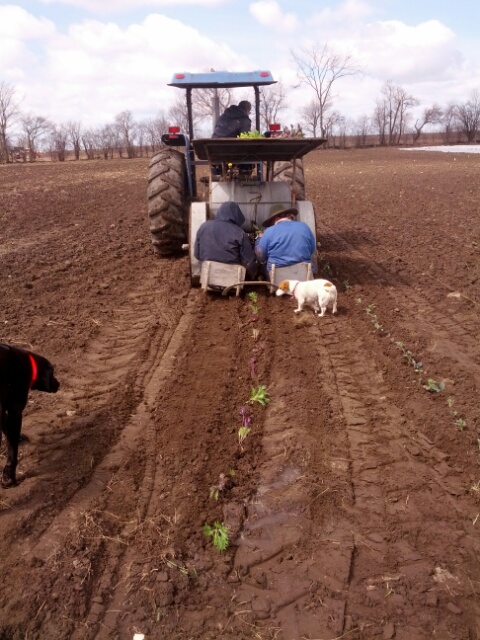 Since the team was busy ploughing with Ian – Dave drove the tractor while Jessica and Karen hopped in the transplanter and used large amounts of coordination and cooperation to put little baby kale plants into the garden. Don’t they look great? Oh, and Penny and Missy inspected the job…
