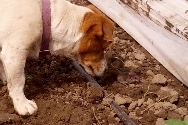 As the weather warmed up last week, we uncovered the Brassicas to do some weeding. And there were a few… missing! Best we can tell, Penny found the culprit:
